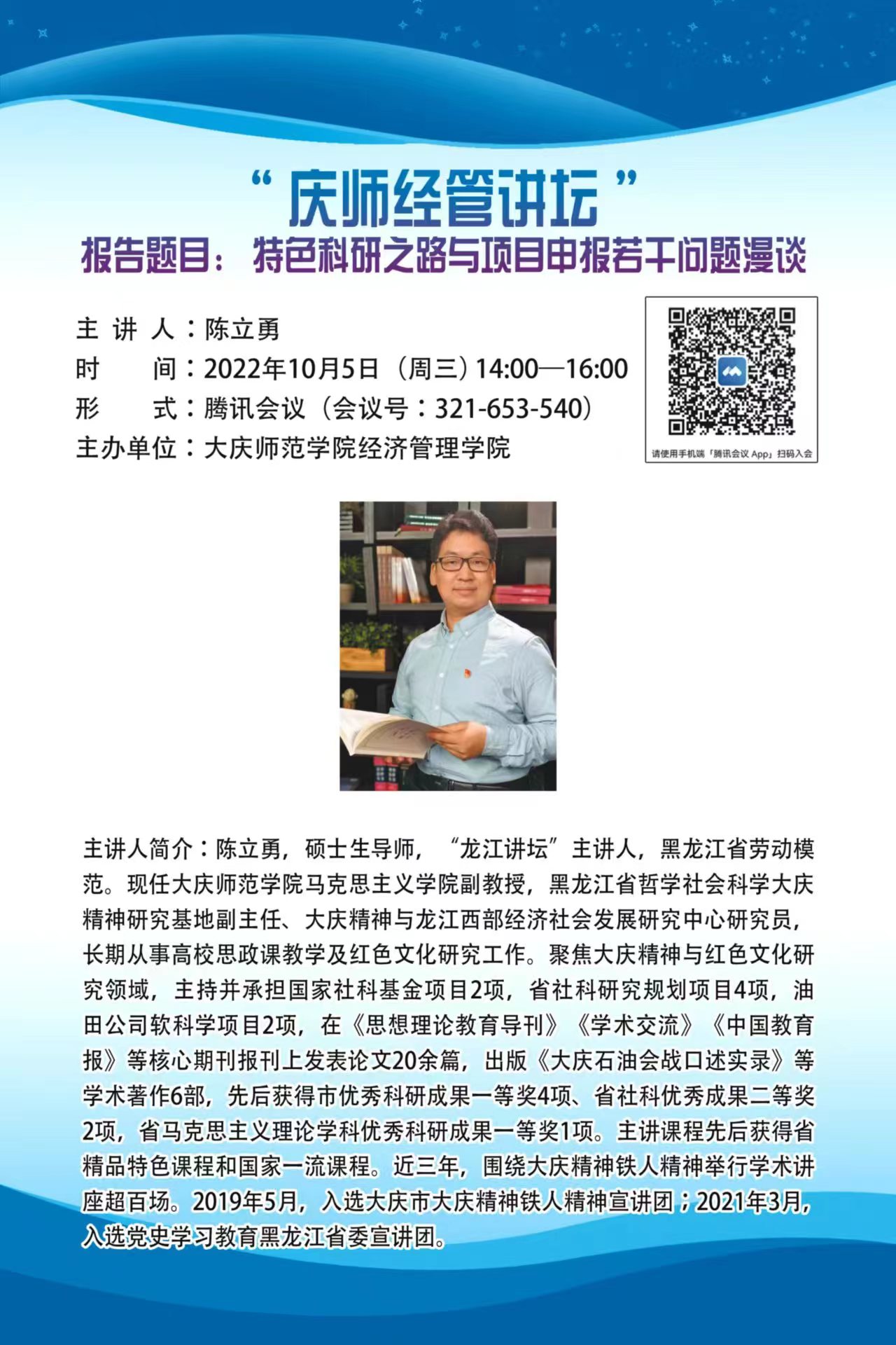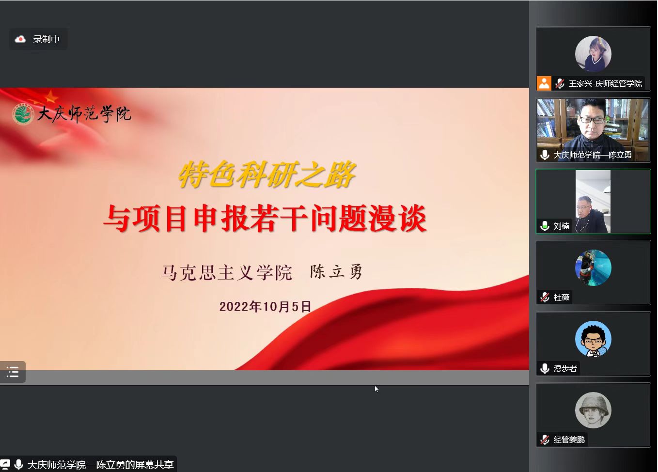 10月5日下午,黑龙江省哲学社会科学大庆精神研究基地副主任、大庆精神与龙江西部经济社会发展研究中心研究员、kaiyun开云官方马克思主义学院陈立勇副教授受邀做了题为《特色科研之路与项目申报若干问题漫谈》的专题讲座。讲座采用线上腾讯会议形式,由kaiyun开云官方行政负责人刘楠教授主持,部分文科学院院长、科研副院长、教师以及经管学院全体教师等100余人参会。