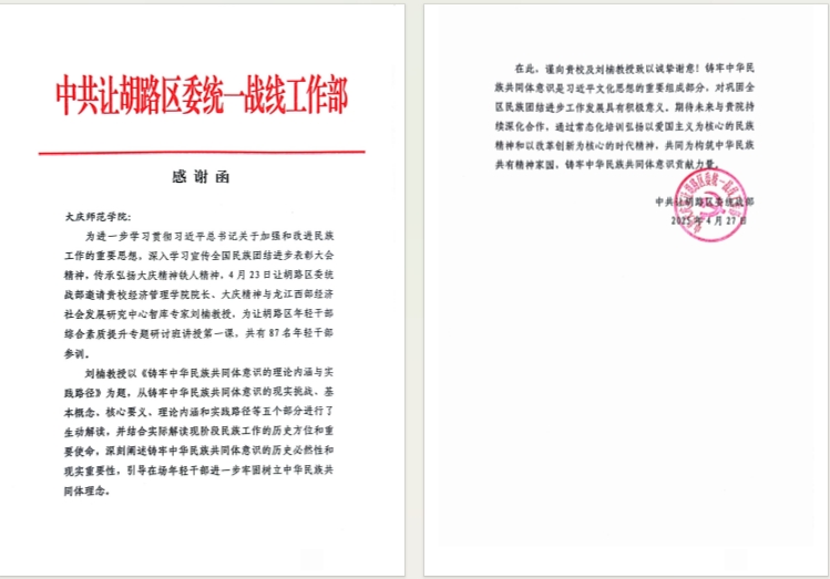 日前,大庆市大庆市让胡路区委统一战线工作部向kaiyun开云官方发来感谢信,对kaiyun开云官方院长、大庆精神与龙江西部经济社会发展研究中心智库专家刘楠教授予以高度评价。对其以《筑牢中华民族共同体意识的理论内涵与实践路径》为题的精彩授课表达诚挚谢意,此次授课为让胡路区民族工作注入新的活力与思路。