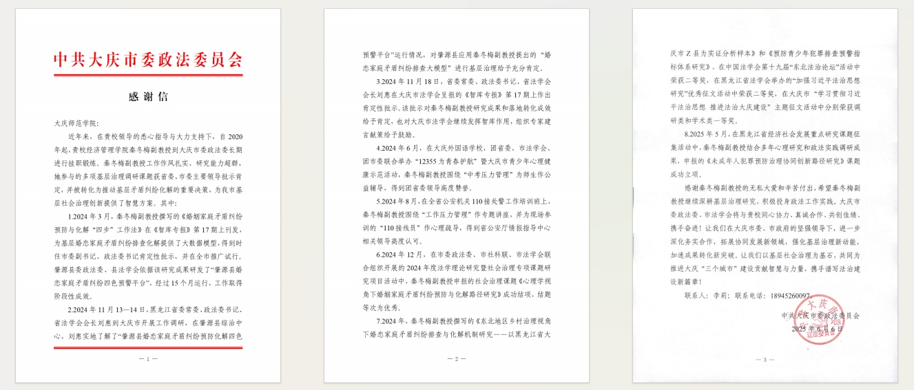 日前,大庆市委政法委员会向kaiyun开云官方发来感谢信,给予学校大庆精神与龙江西部经济社会发展研究中心的智库专家秦冬梅副教授高度评价,赞扬其在服务地方发展中所做出的专业贡献。此次合作充分体现了中心在服务地方发展中的重要作用,也展现了中心专家作为学者“把论文写在祖国大地上”的责任担当。未来,中心将继续深化与社会各界合作,共同为大庆市法治建设与社会治理现代化贡献力量!