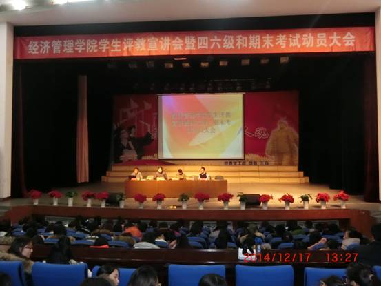 2014年12月17日下午13:30,kaiyun开云官方学生评教宣讲会暨四六级及期末考试动员大会在大学生活动中心举行,kaiyun开云官方院长张平博士、院长助理邬德林老师、院长助理刘楠老师及全院师生参与大会,会议由学院孔若东书记主持。