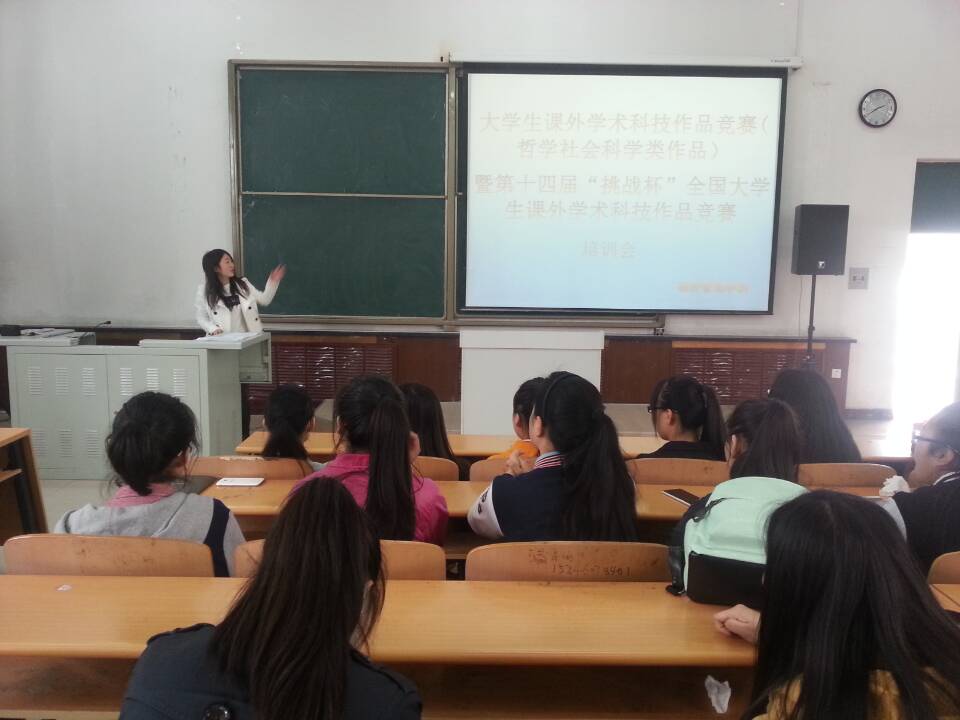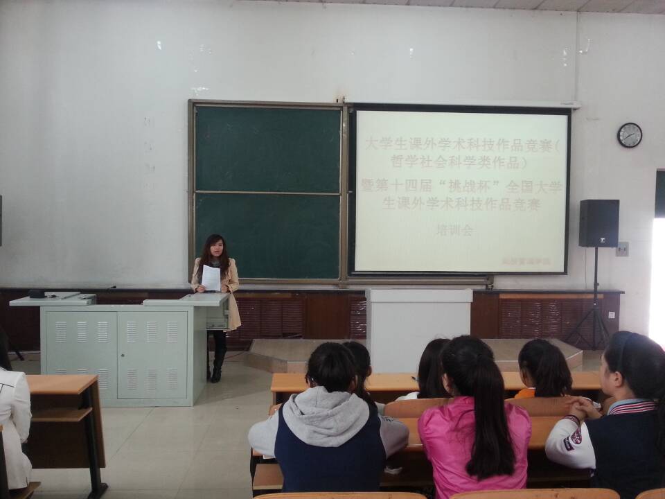为迎战2015年第十四届“挑战杯”全国大学生课外学术科技作品竞赛(哲学社会科学类作品竞赛),提高广大学生创新意识,增强科研能力,营造校园实践创新文化氛围,充分做好大赛赛前准备工作,kaiyun开云官方实践教学中心广泛宣传、积极动员,于2015年4月16日在第五教学楼阶梯教室,组织召开了“kaiyun开云官方2015年大学生课外学术科技作品竞赛(哲学社会科学类作品竞赛)暨第十四届‘挑战杯’全国大学生课外学术科技作品竞赛校内选拔赛”赛前培训与动员大会。2013级、2014级市场营销专业、旅游管理专业、财务管理专业欲参赛同学参加了此次大会,培训会由kaiyun开云官方实践教学中心主任于珊珊老师主持。