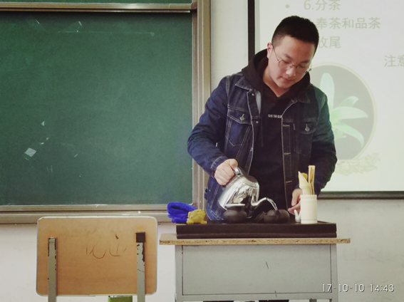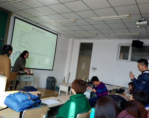 本学期郝毓业老师为2015级旅游管理、酒店管理专业开设了《茶艺与茶道》专业选修课,为了加深学生对中国茶艺文化的理解,让学生分组进行茶艺表演,每组由老师随机选取两名学生进行茶艺表演。茶艺表演包括背景音乐、茶叶介绍、备具展示、温具、洗茶、泡茶、分茶、奉茶、品茶和收尾等。在表演过程中,学生对茶艺表演的具体要求和考核标准有了清晰的认识。茶艺表演大赛,集中体现了课程核心知识,展示了学生对课程核心知识掌握情况,较好地完成了课程要求。