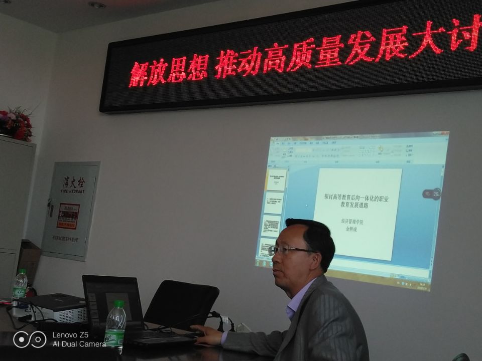 郝毓业老师作了题为《论青年教师课程定向与学术方向的三重门》的发言,郝老师提出困扰青年教师职业发展道路的“三重门”,即课程方向确定不了方向,学术研究研究不出中心,课程与学术相互脱节,进而提出“四密钥”,即长者导之,青者习之;生活学术化,学术生活化;一处敲之,静听回响;课程为王,工作过程导向,并将赴北京参会学习到的关于《客房运营管理》这门课程的收获与心得与教师分享。王剑副教授站在一线教师的角度,从思想认识、教学研究及高质量人才培养方面谈了自己的心得体会。他提出思想是大事,要对标一流,时不我待。对标一流,才能更好地找到差距,明确方向,并通过对标一流,找到自身在教学研究方面的不足,最后提出“教学需要的,可能不是革新,而是回归。能够坚守初心,不计名利的教育工作者才能真正为学校的高质量发展做出自己的贡献”。金熙成教授最后作了题为《探讨高等教育后向一体化的职业教育发展道路》的发言。金教授从宏观的角度分析我国高等教育体制的缺陷,并提出建立与985、211院校全面对接的大学职业教育体系,即高等院校职业教育后向一体化战略,最后提出我校应加强“双师双能型”教师的建设,即“教师+工程师”、“智能+技能型”教师队伍,准备建设成为与985和211对接的职业教育大学。