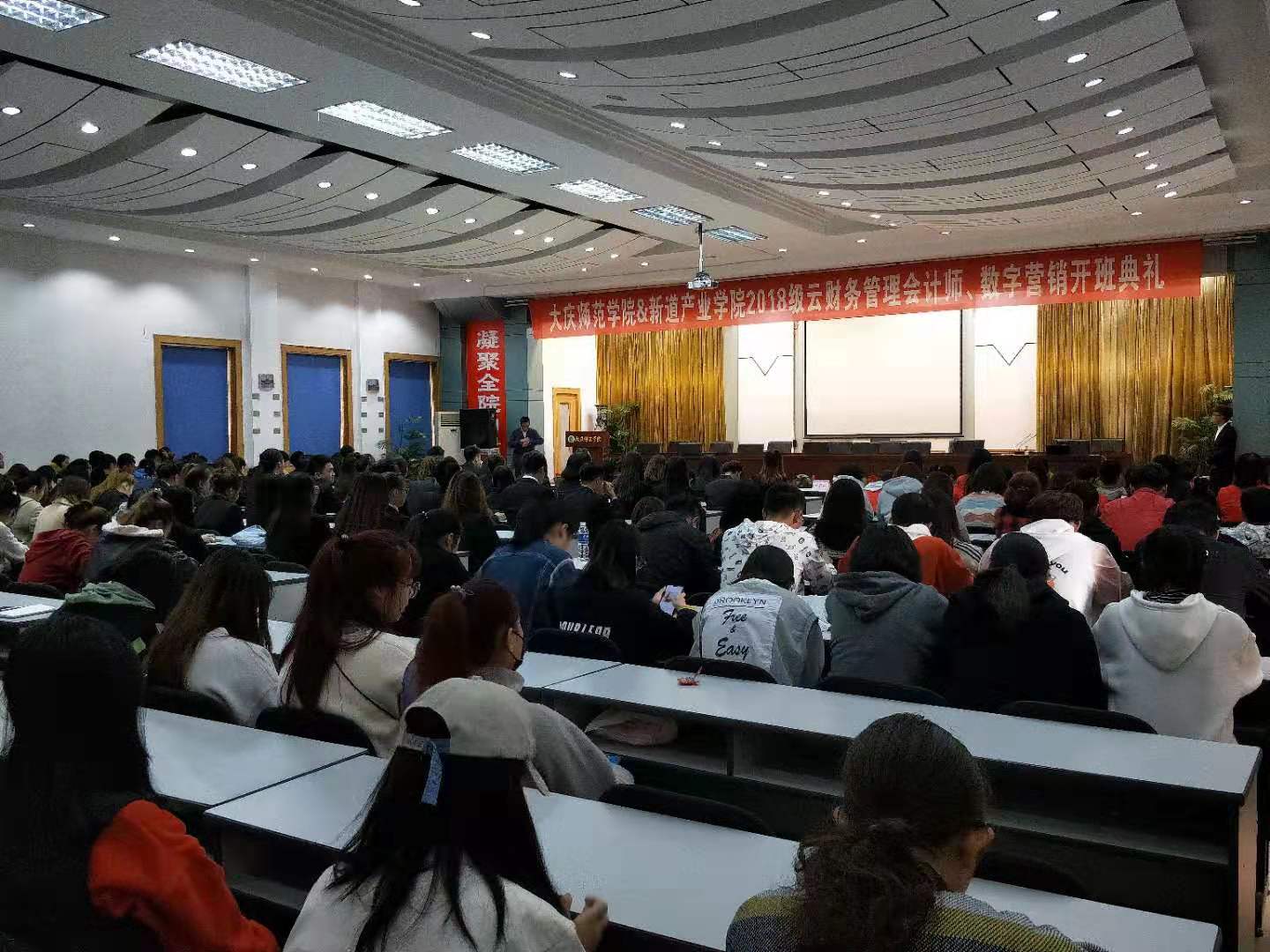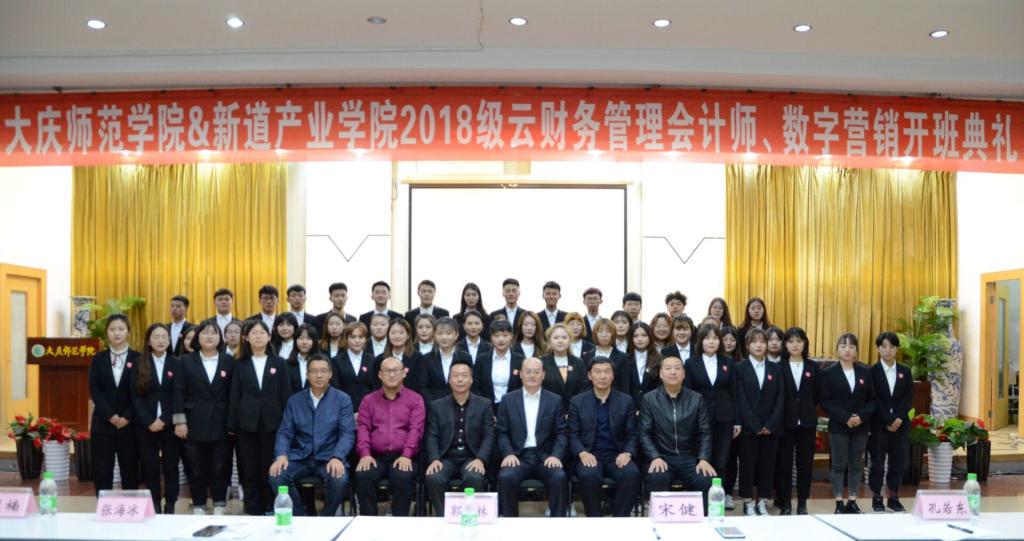 产教融合培养应用型经管类人才,我校与新道科技有限公司合作,于2019年10月23日下午15点30分在kaiyun开云官方铁人讲堂举行2018级云财务管理会计师、数字营销开班典礼。新道科技有限公司高级副总裁宋健先生、黑龙江省总经理张海冰先生、黑龙江省区域经理王学松先生,kaiyun开云官方副校长郭崇林教授、kaiyun开云官方孔若东书记、刘楠院长、部分教师代表、辅导员、2018级财务管理专业和市场营销专业全体学生,2019级学生代表参加了此次开班典礼,典礼由刘楠院长主持。