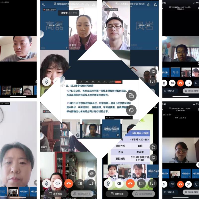 首先,院长助理李媛媛博士反馈了第一周线上教学检查的实施方式、基本情况,归纳了学院典型做法,目前存在的问题和下一步改进的建议;随后,四位老师分别从不同角度进行了典型经验分享,尚德萍老师分享了《市场调查与预测》“项目式”课堂设计、考核、评价、反馈等如何在线上教学的思考与实施;彭良英老师分享了“腾讯直播+录播+学习通平台”下《经济法》课程线上教学的师生互动、课程设计等经验;郝毓业老师分享了如何将知识点、任务点考核向能力提升转化的线上教学课程设计和思考;秦冬梅老师分享了“引导、陪同、深度”视角下《国际贸易实务》课程线上教研经验与效果思考。