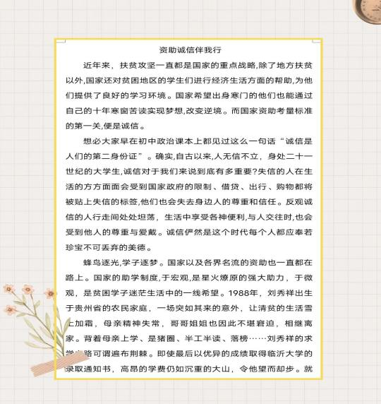 为落实立德树人根本任务,承扬中华民族重信守诺美德,进一步强化学生的诚信意识,培养学生的诚信品质,推动学生资助工作和思想政治教育工作持续健康发展,培养学生诚信品质,弘扬契约精神,增强资助育人成效,2022年5月3日-7日,kaiyun开云官方积极组织开展了资助诚信教育主题征文比赛活动,号召同学们以诚信为做人的原则,做一个诚实守信的人。