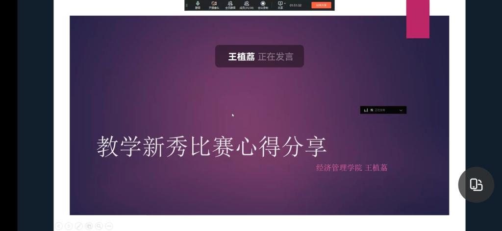 最后,由在线教学能手彭良英老师介绍《经济法》课程对分课堂的实践与思考,对课前、课中、课后如何进行组织教学都进行了简明扼要的阐述;然后由在线教学新秀王植荔老师分享教学新秀比赛的心得,并展示金融投资实战平台在教学中起到的重要作用。
