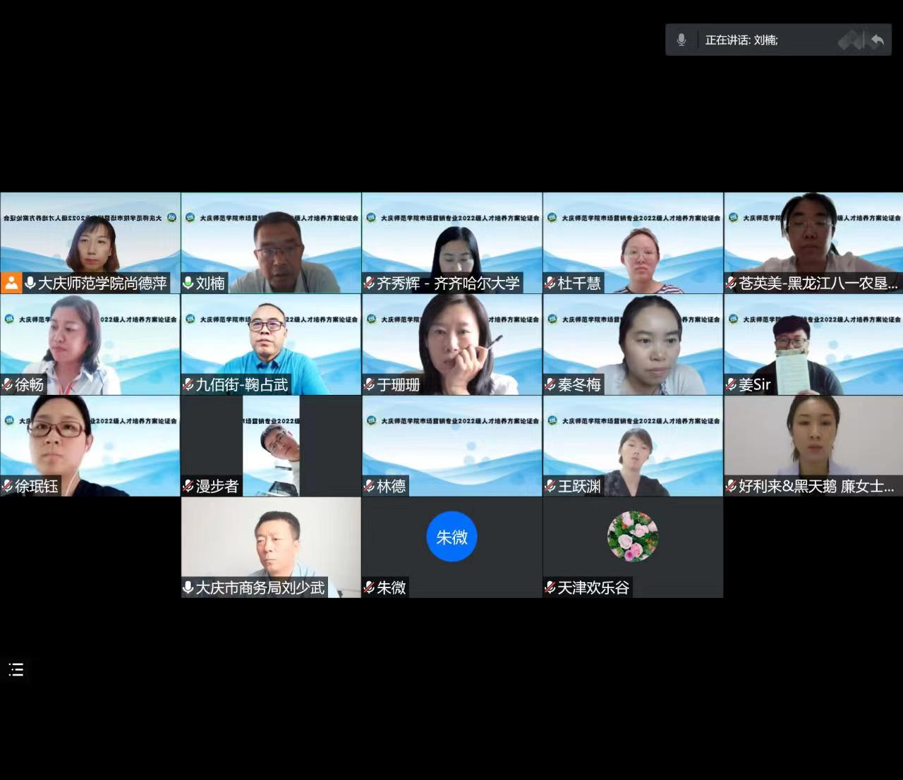 2022年7月15日13:30-15:30,市场营销系召开了2022级人才培养方案论证会,会议采用腾讯会议的方式,邀请了政府、合作企业和高校的专家10位,大庆市商务局电子商务科科长刘少武、齐齐哈尔大学市场营销系主任齐秀辉、东北石油大学营销与旅游系主任徐畅、黑龙江八一农垦大学市场营销系主任苍英美、北京巨量引擎网络技术有限公司巨量部于珊珊、北京市好利来&黑天鹅餐饮管理有限公司招聘部负责人廉美琦、天津欢乐谷人事部经理刘喆、哈尔滨润牛商业有限公司人力资源部主任王雪、大庆九佰街网络科技有限公司董事长鞠占武10专家和kaiyun开云官方行政负责人刘楠、教学负责人李媛媛、科研负责人孙伟仁以及市场营销系全体教师参加了论证会,会议由市场营销系主任尚德萍主持。