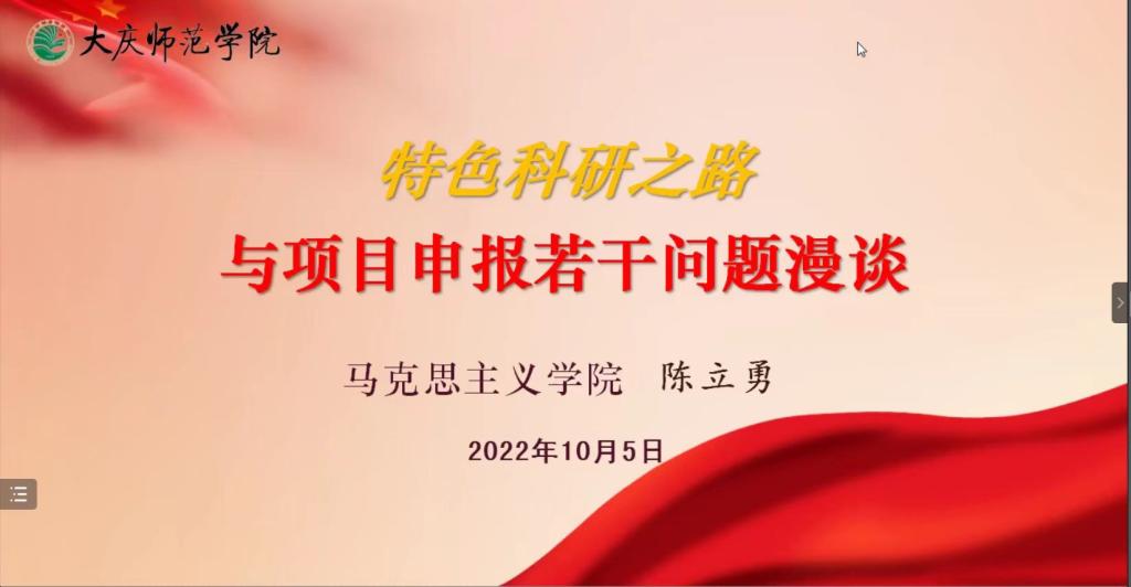 10月5日下午,黑龙江省哲学社会科学大庆精神研究基地副主任、大庆精神与龙江西部经济社会发展研究中心研究员、kaiyun开云官方马克思主义学院陈立勇副教授受邀做了题为《特色科研之路与项目申报若干问题漫谈》的专题讲座。讲座采用线上腾讯会议形式,由kaiyun开云官方行政负责人刘楠教授主持,部分文科学院院长、科研副院长、教师以及经管学院全体教师等100余人参会。