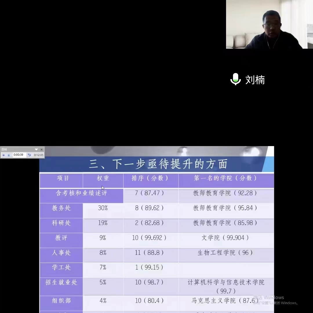 首先由学院行政负责人刘楠教授对2022年kaiyun开云官方工作进行总结汇报。汇报大致分为四项,第一项,工作亮点,2022年学院按计划较好完成了学校的工作任务,在党建、教学改革、科研学科建设、师资建设、就业率等方面取得工作亮点十四项,突破十项,完成或超额完成增值性评价指标十五项。第二项,主要工作开展情况,刘楠教授对党建思政建设、教育教学改革、科研社会服务、师资队伍建设以及就业体系建设五个方面进行汇报。第三项,下一步亟待提升的方面,刘楠教授制作年终统计表将权重较大的考核项目一一列出,分析学院与其他兄弟院系间存在的差距,表示下一步将对标短板,再创佳绩。经分析总结,亟待提升的主要有以下三个方面,第一,课程建设水平亟待提升,需填补省级课程五大类方面的空白;第二,专任教师师资力量亟待加强,需补充专任教师数量;第三学科建设亟待突破,需调动教师参与科研、社会服务积极性。第四项,2023年工作思路汇报,第一步将继续深入学习领会党的二十大精神和习近平谈治国理政(第四卷)将在加强师德师风建设、落实意识形态工作责任制、落实党建工作责任制、规范“三会一课”制度和党内组织生活方面有新要求。第二步是对标对表普通高校专业质量、一流专业和专业论证标准,进一步补短板、抓落实,通过全面推进与重点扶持相结合、教学工作坊、学科竞赛重面强制、以银行班创业班等特色行业班为引领,助力创新创业学院特色。第三步是以打造高层双师双能型师资队伍为目标,引进人才,用好、留住人才;加强带头人培养;鼓励提升学历和参与实践锻炼,以提升教师综合实践能力。第四步是围绕旅游管理硕士点建设,继续强化有组织科研,完善激励机制、凝聚科研资源、强化内涵建设。第五步是强化就业指导、针对服务、持续跟踪、就业包保,引导学生树立积极正确的择业观和就业观,目标是2023届毕业生就业率高于学校平均水平。