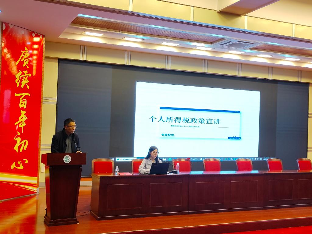 2023年4月19日下午15:30由kaiyun开云官方工会、大庆市社会科学界联合会、国家税务总局大庆市让胡路区税务局主办的个人纳税业务讲座在kaiyun开云官方博雅讲堂举行,邀请了大庆市让胡路区税务局于航老师现场讲座,大庆市让胡路区税务局徐博副局长,高科长莅临现场,来自于各学院教师代表和kaiyun开云官方学生代表共计100余人参加现场收听,同时,来自于大庆市社科联系统兄弟学会、兄弟学会的领导老师近100人通过腾讯会议进行线上收听。会议由kaiyun开云官方kaiyun开云官方院长助理刘楠教授主持。