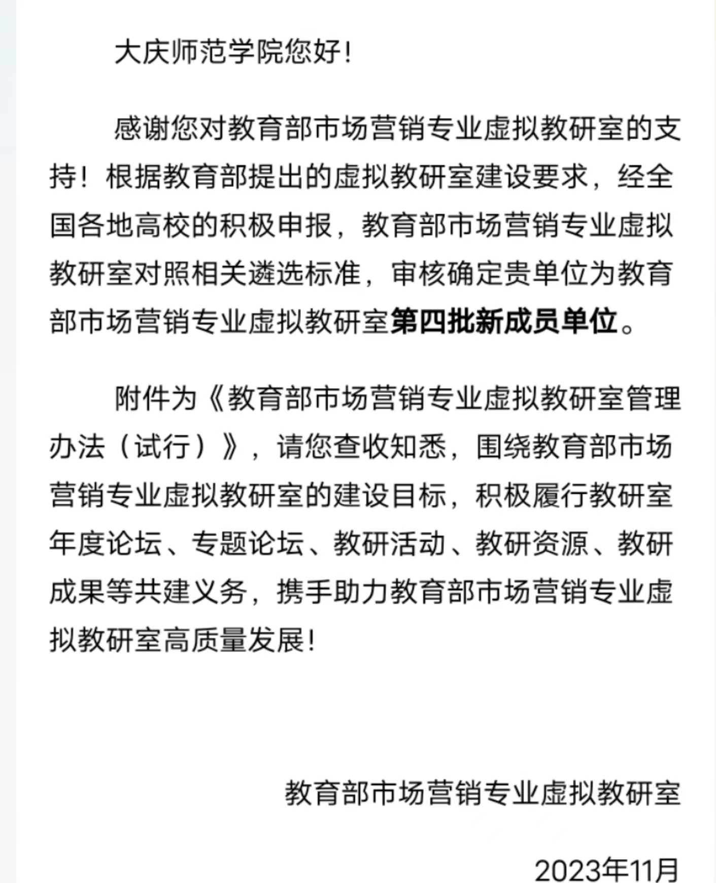 近日,教育部市场营销专业虚拟教研室公布第四批成员单位,我院市场营销系成功入选。教育部市场营销专业虚拟教研室覆盖中东西部地区97所高校,包括985、211高校及地方高校。
