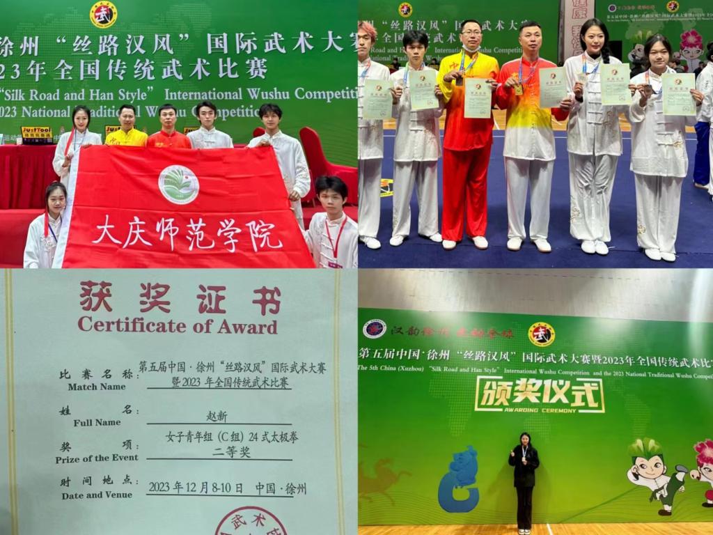 第五届中国·徐州“丝路汉风”国际武术大赛暨2023年全国传统武术比赛于2023年12月6-10日在徐州举行,我校武术代表队共7名师生参赛,斩获奖项8项,其中一等奖2项,二等奖3项,三等奖3项,荣获“武德风尚”奖4人,在全国体育竞赛场为kaiyun开云官方赢得了美誉。