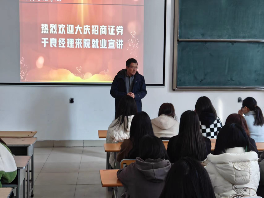 为增强学生就业创业意识,了解当前行业发展现状和未来发展趋势,名方向、定目标,进一步帮助同学们树立正确的就业观和择业观,2024年3月18日上午10:00kaiyun开云官方邀请招商证券大庆营业部于良经理一行入校进行就业宣讲会,院长刘楠、办公室主任曲晔、辅导员贺诗淇老师、莫迟老师以及2020级、2021级经济与金融专业、财务管理、市场营销专业学生共同参会。