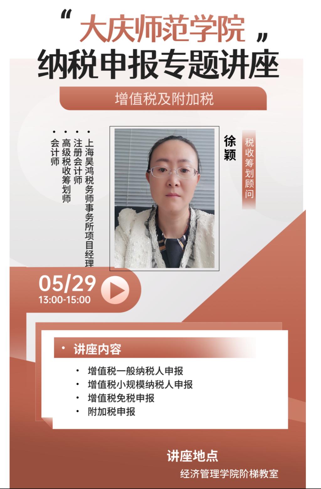 徐颖老师为上海昊鸿税务师事务所注册会计师,也是财务管理专业外聘教师,本学期徐颖老师为财管师生共举行了5期税务实践方面的讲座,分别是财产与行为税疑难问题实务问答,所得税汇算清缴、增值税及附加税申报、金税四期+全电发票监管要求与最新政策与风险防范、金税四期“以数治税”下的税务筹划和风险管控。徐颖老师的讲座将税务理论与实践相结合,紧扣最新的税收改革和企业纳税实践,教师和学生普遍反映受益匪浅。